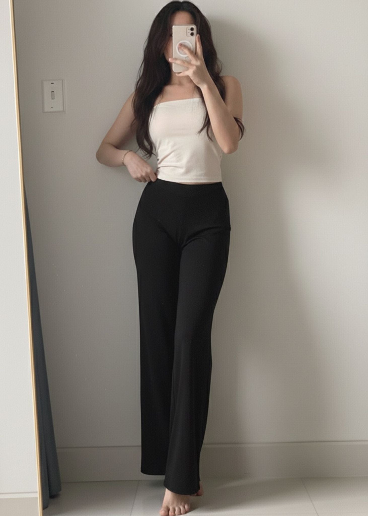 Straight-leg pants create a clean line that makes your legs look longer and more balanced.